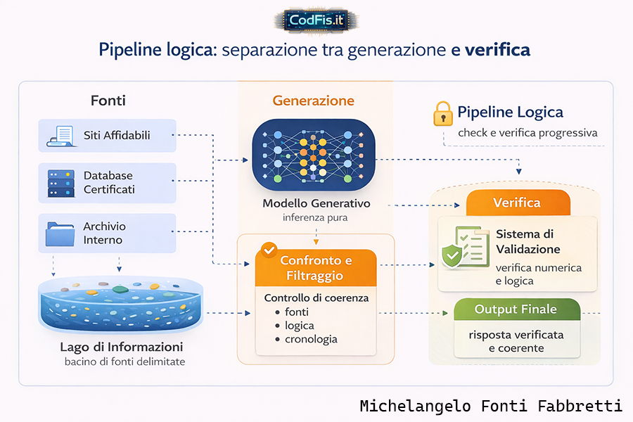 Il punto di svolta, quello che rende possibile un'IA generativa senza allucinazioni, non è il modello in sè, ma ciò che gli sta intorno. La mia idea di pipeline logica nasce proprio da questa esigenza: separare in modo netto ciò che genera da ciò che verifica. Se due funzioni restano fuse nello stesso livello, l'errore non è solo possibile, è statisticamente inevitabile.