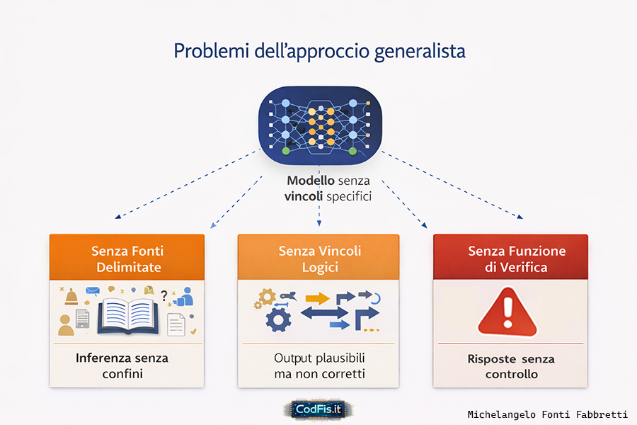 Un sistema generalista è costretto a trattare ogni richiesta come equivalente, anche quando non lo è. Non distingue ciò che richiede rigore da ciò che ammette approssimazione. Non separa il contesto narrativo da quello tecnico, l'opinione dall'informazione verificabile. In assenza di una struttura che discrimini, tutto viene appiattito sul piano della plausibilità.